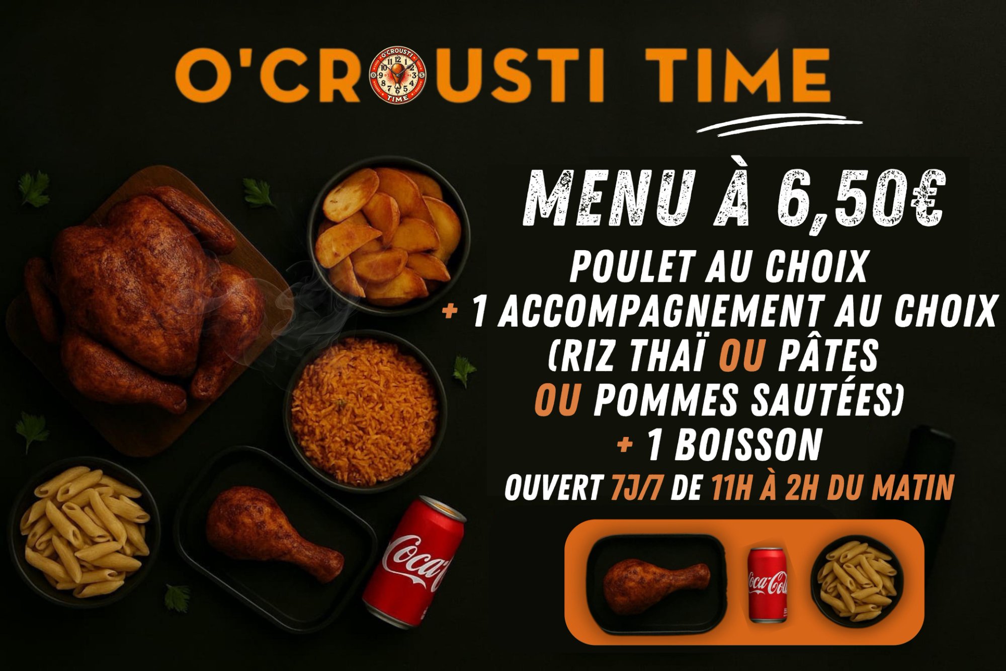 Poulet au choix + accompagnement + boisson. Le combo parfait à petit prix.